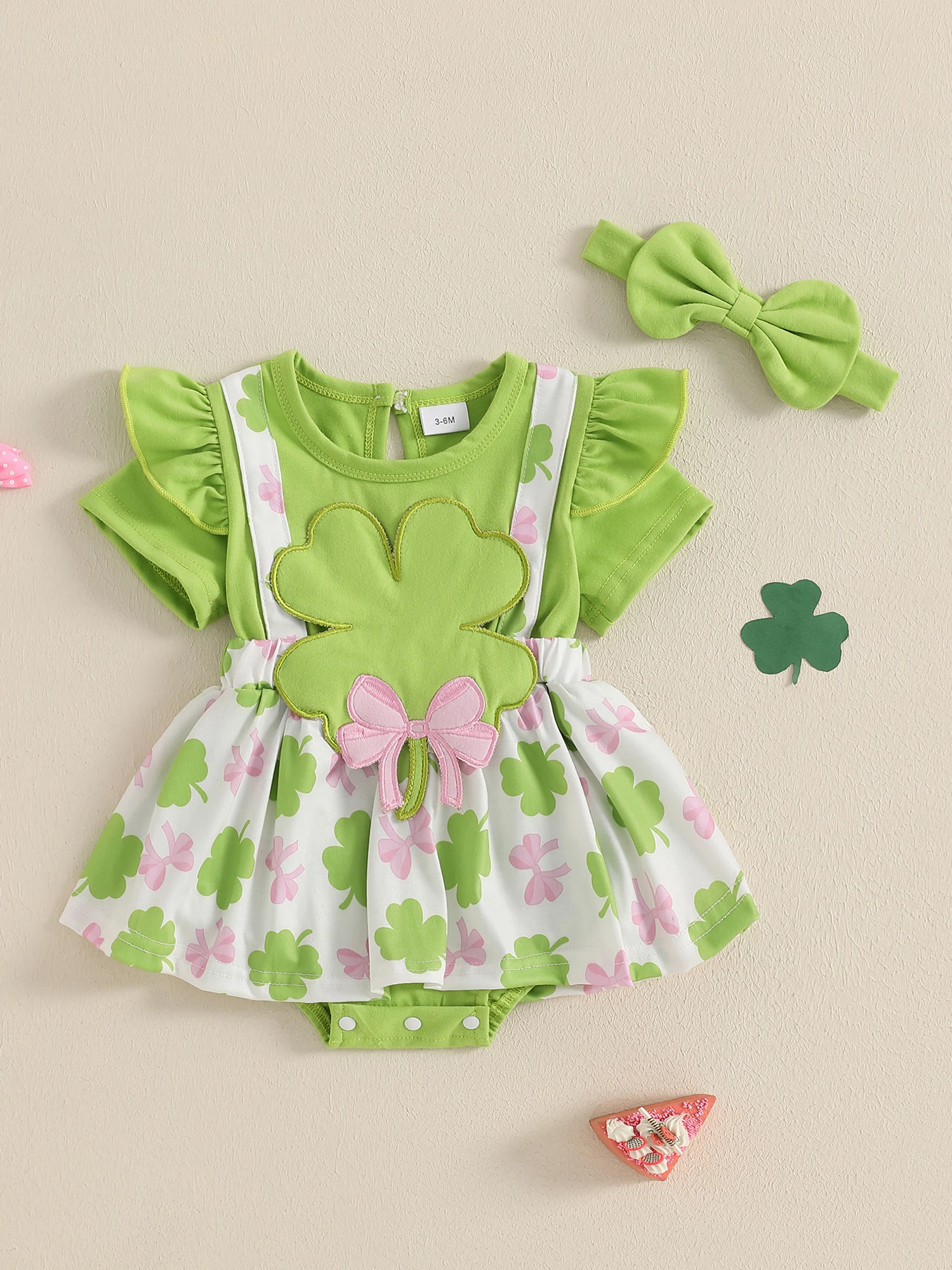 St Patrick s Day Baby Girl Outfit Shamrock Print Romper Dress with Bow Headband and Ruffled Skirt Hem Infant