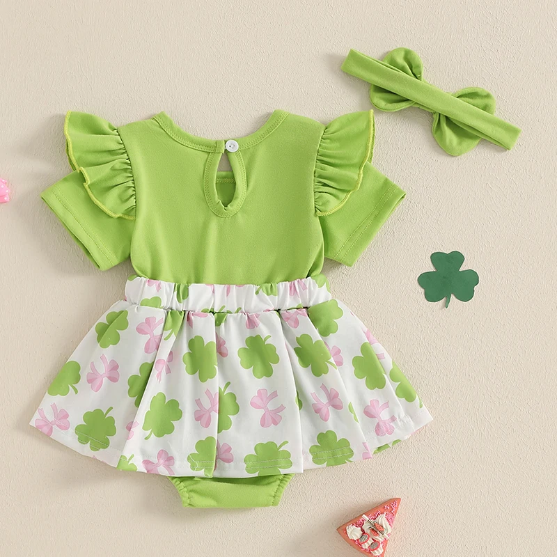 Baby Girls Rompers Dress Irish Clothes Clover Bow Print Short Sleeve Skirt Hem Infant Bodysuits Jumpsuits with Headband