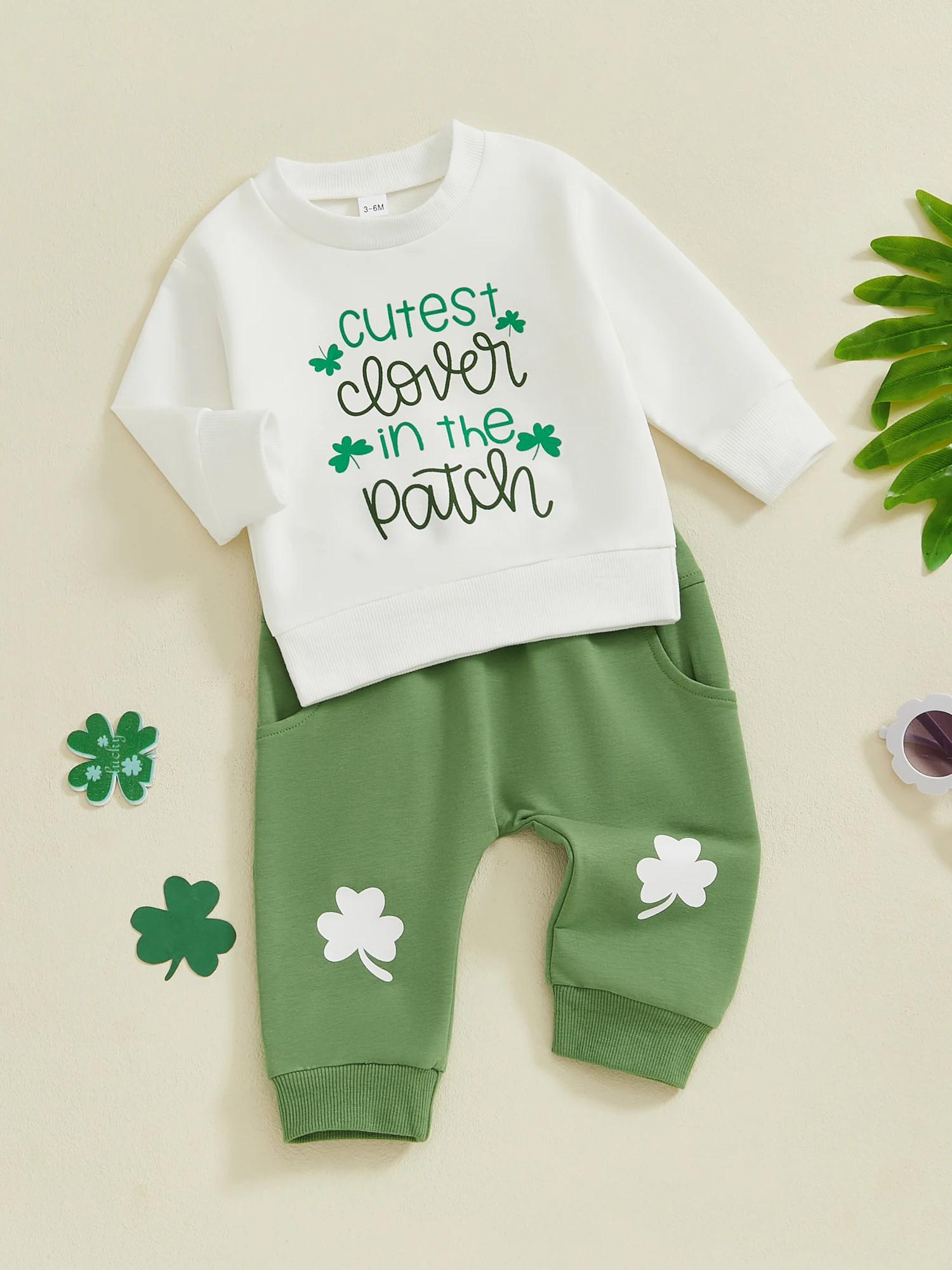 Baby Irish Day Outfit Letter Clover Print Long Sleeve Sweatshirt and Elastic Pants Set for Newborn Infant Fall Clothes