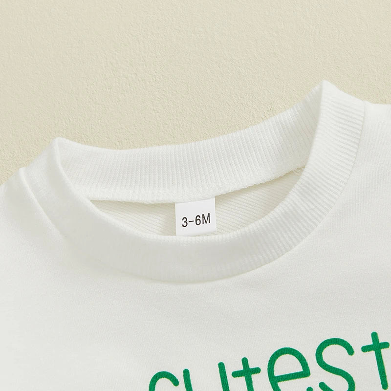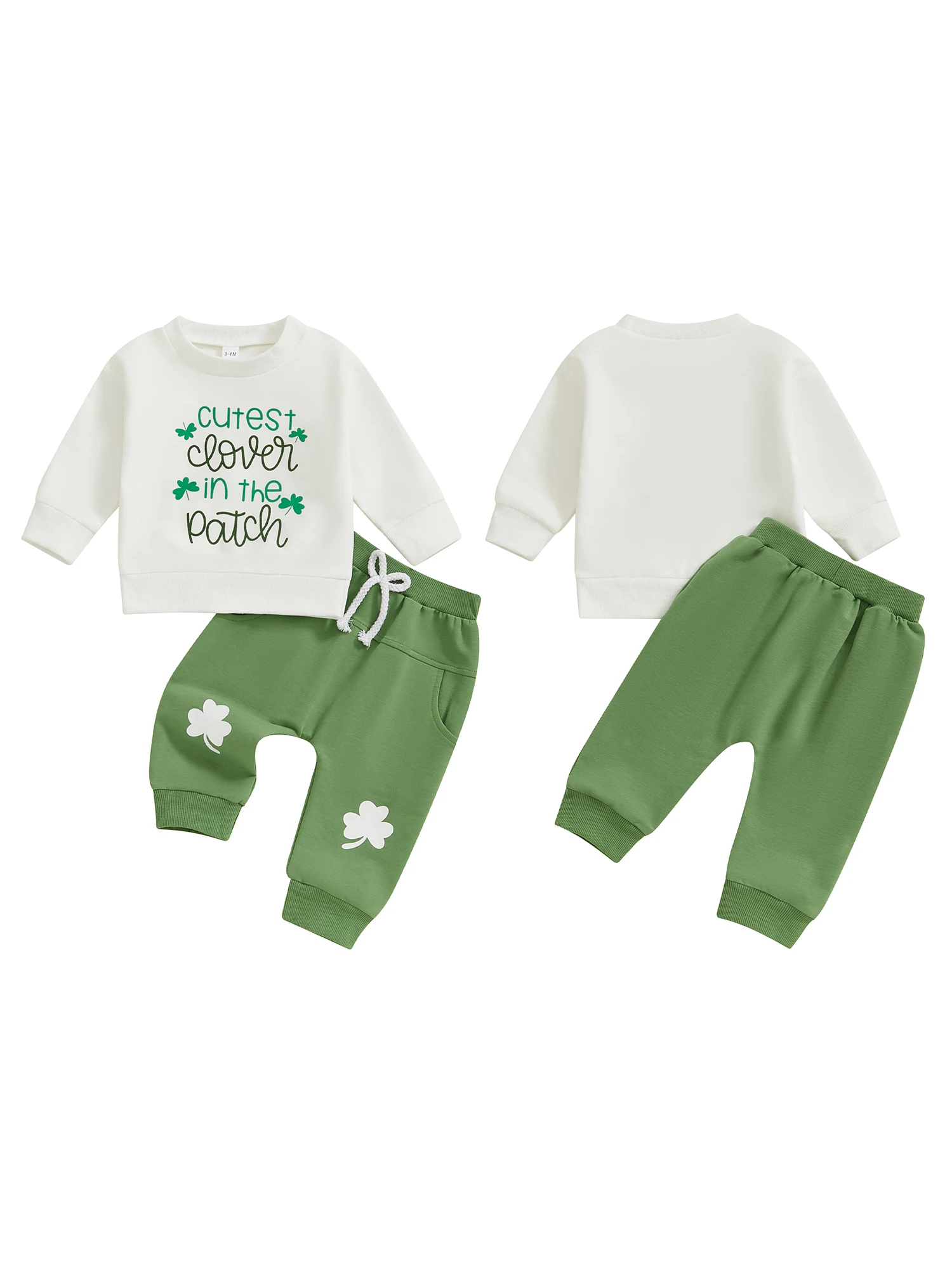 Baby Irish Day outfit with classic letter clover print; Baby sweatshirt with round neck and long sleeves; Baby pants with elastic waist for easy fit; Simple yet stylish, your little one will receive a lot of compliments wearing it