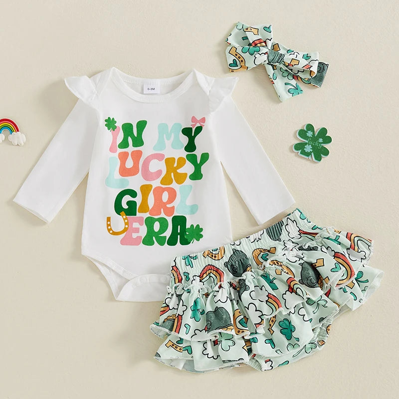 Baby Girl Irish Outfits Clover Letter Print Crew Neck Long Sleeve Romper Ruffles Shorts Headband 3Pcs Clothes Set