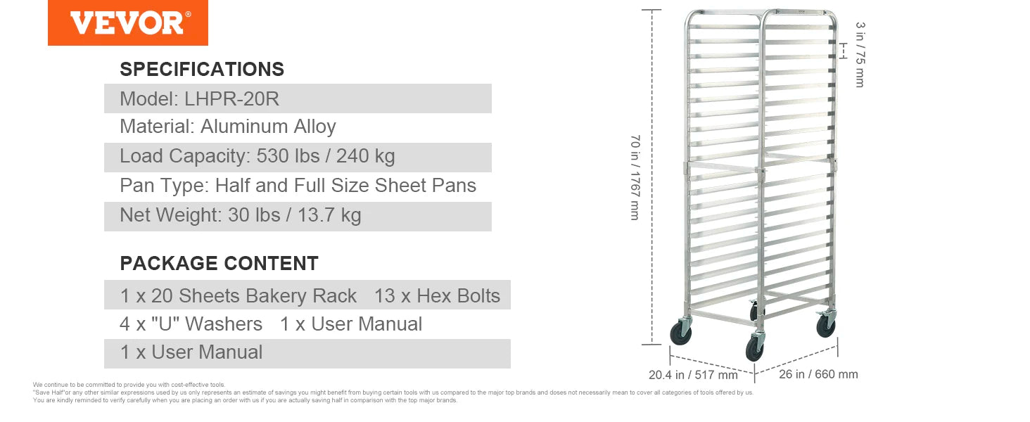 Ample Space & Robust Load Capacity: Our commercial bakery rack offers generous storage for a large quantity of full-size or half-size bun pans or trays. With wider wheels, our load capacity surpasses that of others, ensuring durability and strength. Total Load Capacity: 530 lbs. Each Tier: 75 lbs.