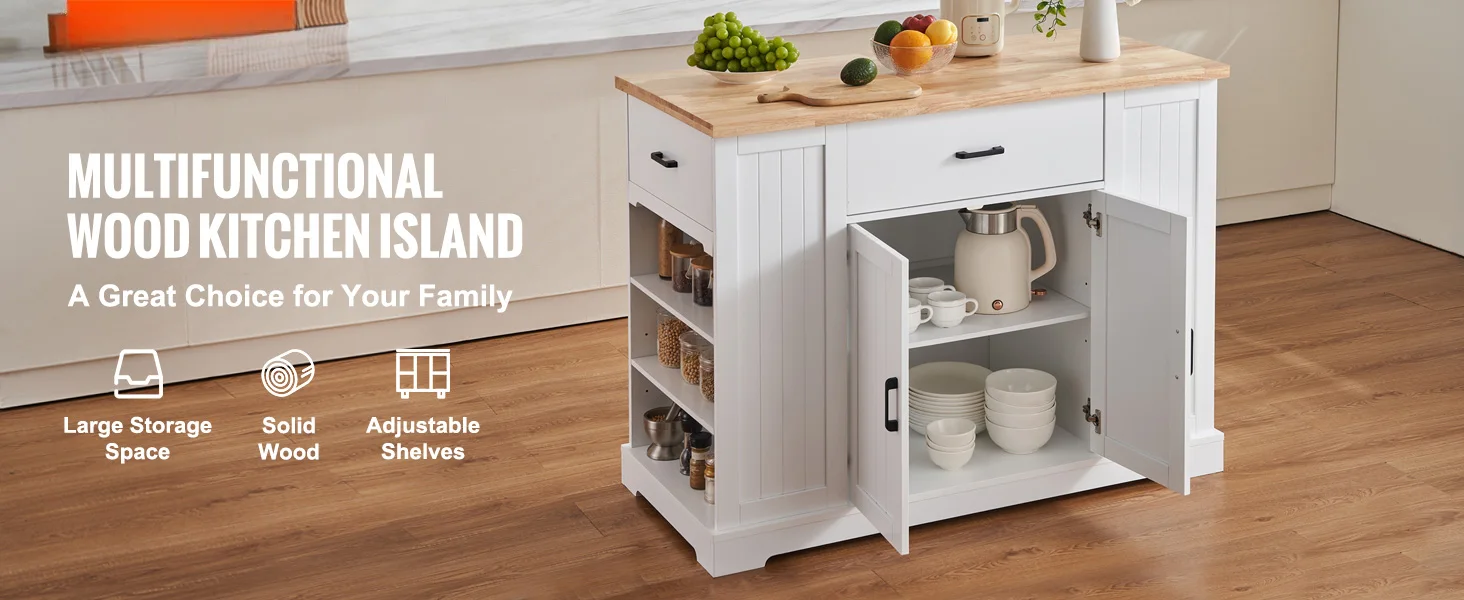 Durable and Sturdy: This 46x22x36 inch kitchen island features a high-quality solid rubberwood top and MDF material, making the surface stain-resistant, waterproof, sturdy, and durable. It provides more storage and work space for your kitchen with flexible mobility.