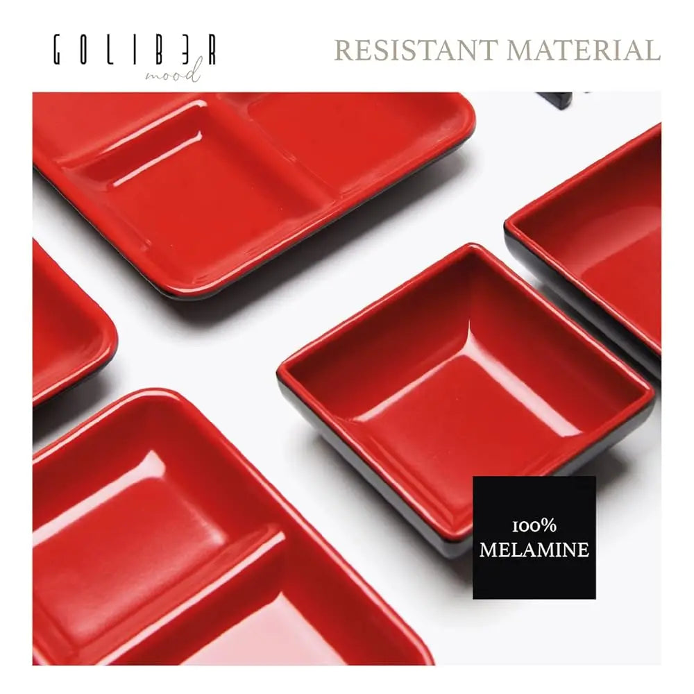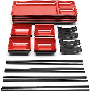 Sushi Serving Set, With 4 Japanese Sushi Serving Plate, 4 Soy Sauce Dish, 4 Pairs Of Chopsticks And 4 Chopsticks Stands- Melamine Serving Set For Sushi (Red)