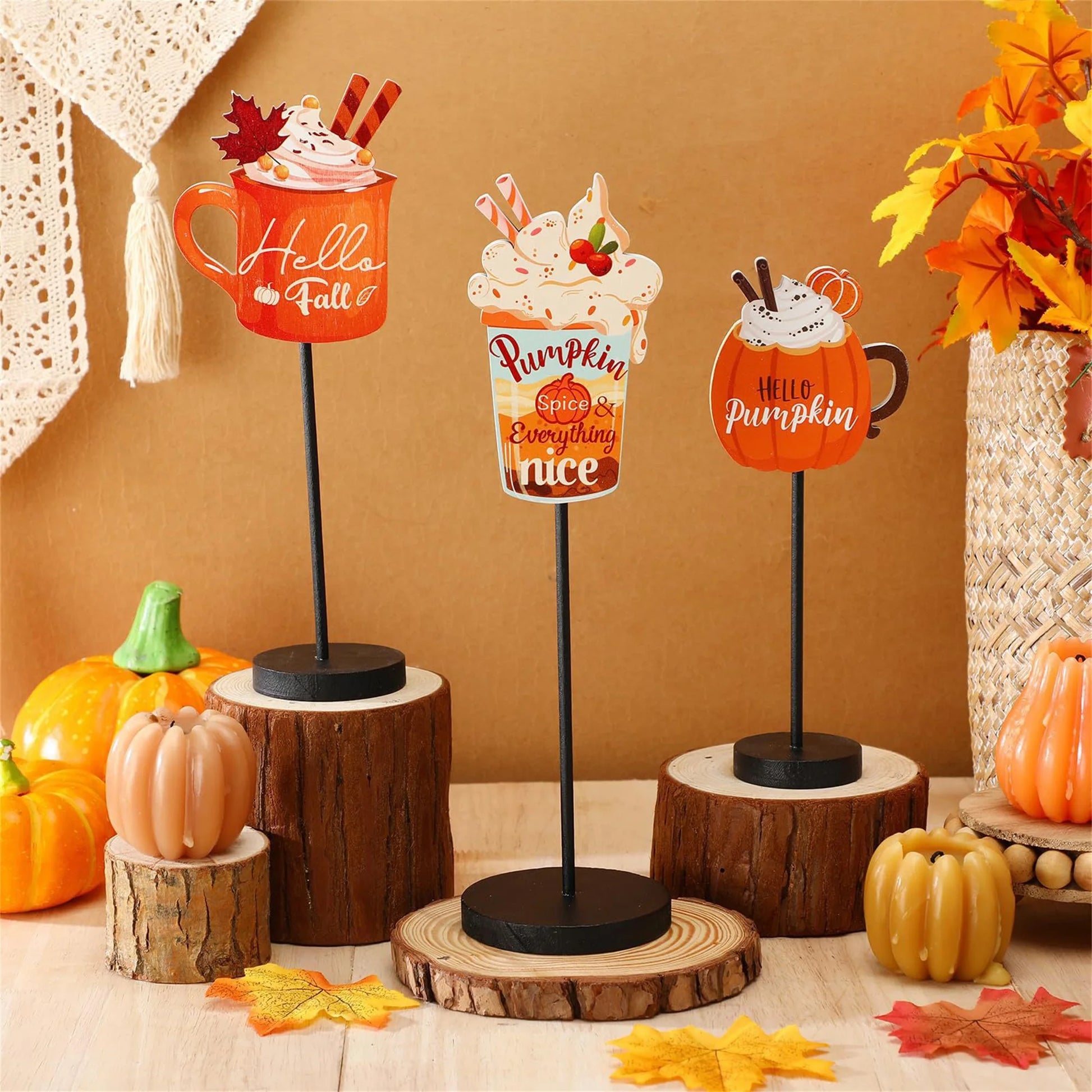 3Pcs Thanksgiving Wood Table Decor Pumpkin Mugs Sign Table Centerpieces for Fall Coffee Bar Indoor Ornament