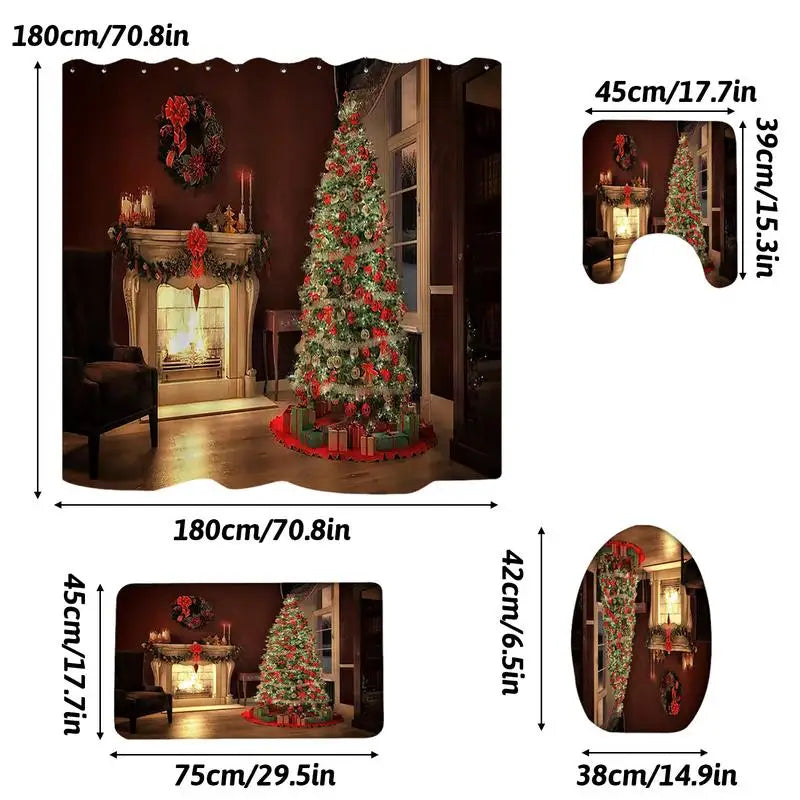 Toilet Lid Cover Rug Set Fast Drying Christmas Tree Shower Curtains Set Creative Shower Drapes Non-Slip Bath Mat For Home