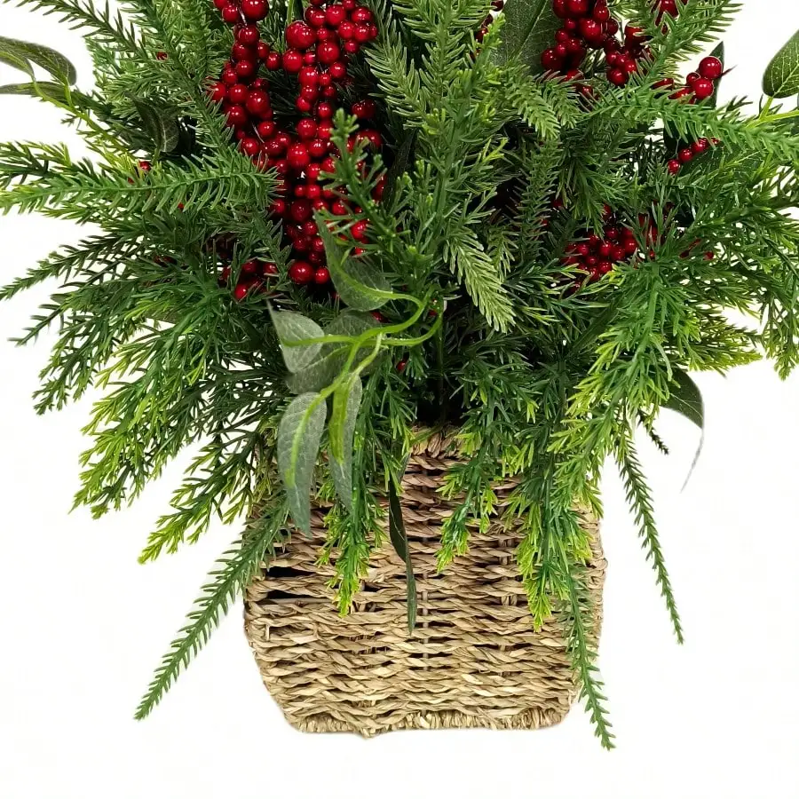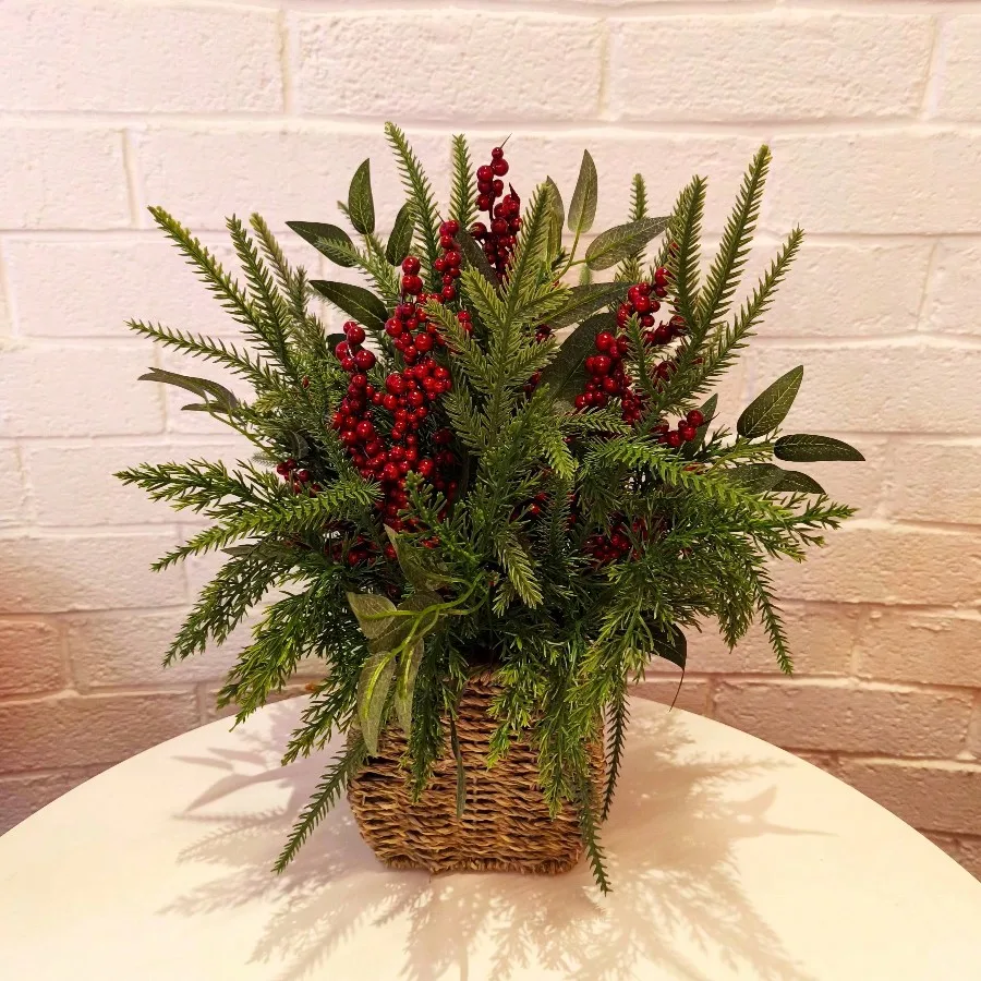 Brighten up your home with the Winter Floral Basket with Berries Christmas Tabletop Decoration. This festive arrangement features lush greenery paired with vibrant red berries, bringing the beauty of the season indoors. Nestled in a woven basket, it offers a natural, rustic charm that complements both traditional and modern Christmas decor. At fifteen inches tall, it makes an eye-catching centerpiece for tables, mantels, or entryways. With its lifelike look and timeless design, this piece is a wonderful way to add seasonal cheer year after year.